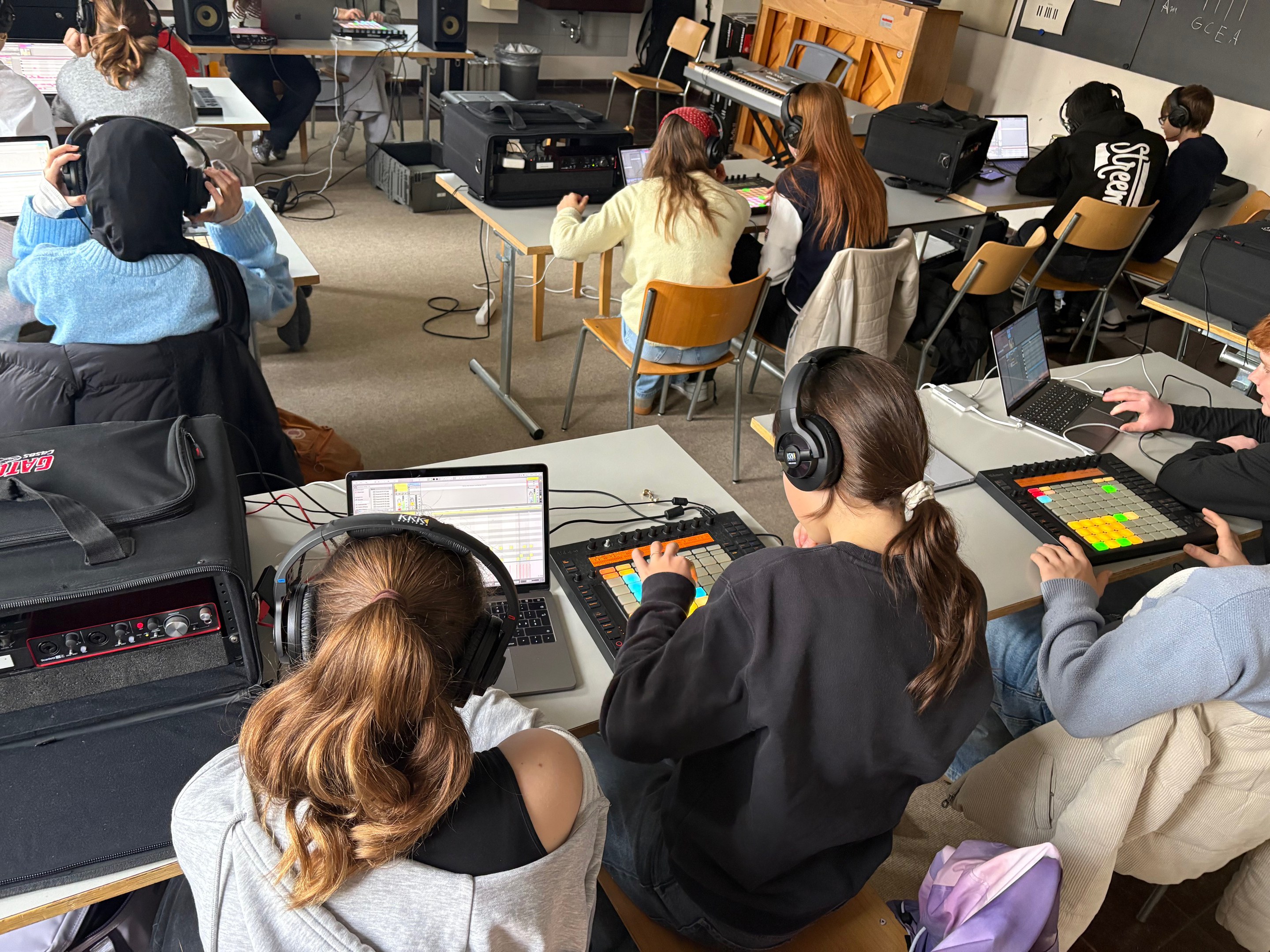 16 motivierte Schüler/innen des Wahlpflichtfachs Musik stammen aus drei verschiedenen Teams der 3. Sekundarstufe und brachten entsprechend vielfältige musikalische Interessen, Sprachen und Ideen mit.